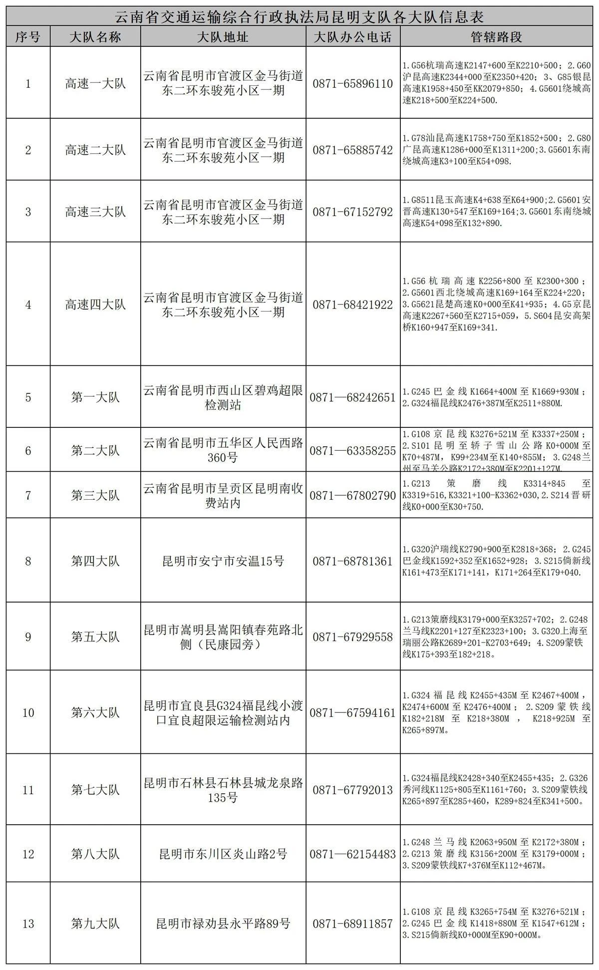 附件:云南省交通运输综合行政执法局昆明支队各大队信息表
