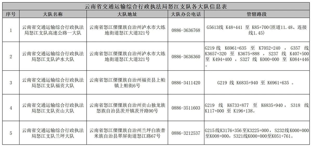 附件:云南省交通运输综合行政执法局怒江支队各大队信息表