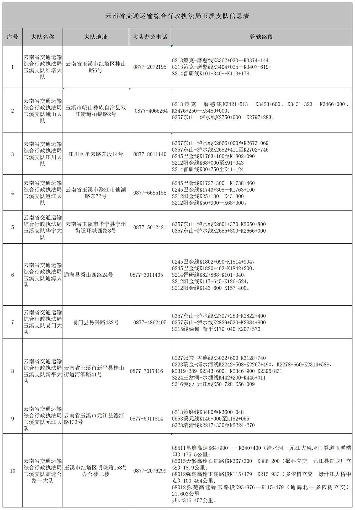 附件:云南省交通运输综合行政执法局玉溪支队各大队信息表