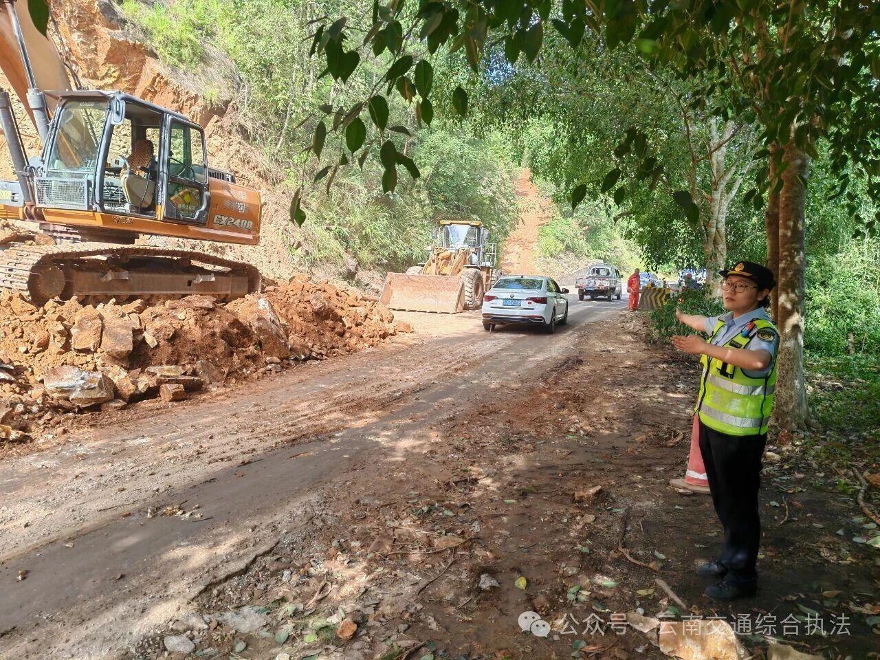 10月4日凌晨1时许,大队辖区G215线K3888+200m至330m处突发山体滑坡,大量土石堆积路面,导致双向交通完全中断。险情发生后,我们立即奔赴前线。在塌方区域前设置警示提醒标志,在两端设置绕行标志,引导沿途滞留车辆有序疏散撤离。在随后的抢险保通工作中,大队执法人员一组奔赴现场进行塌方清理保通,另一组在绕行点指引车辆有序通行。在14个小时的坚守努力下,当日16时左右,滑坡路段恢复半幅通行。