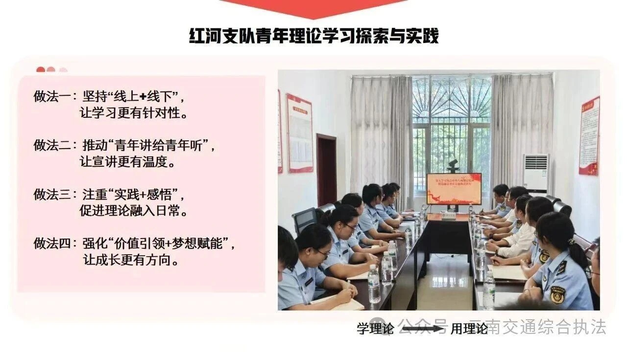 理论学习“活”起来:红河支队通过“青年讲给青年听”让理论宣讲接地气,以“沉浸式案例教学”促理论融入执法实践,实现从“学理论”到“用理论”的深度转化。