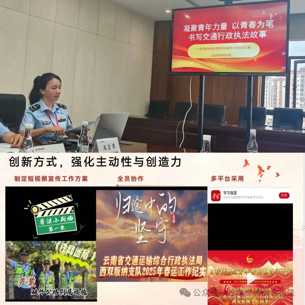宣传阵地“新”起来:西双版纳支队积极创新普法形式,自主策划制作生动有趣、通俗易懂的系列普法短视频,借助新媒体平台实现精准投放和“破圈”传播,有效提升普法覆盖面和交通执法队伍良好形象。