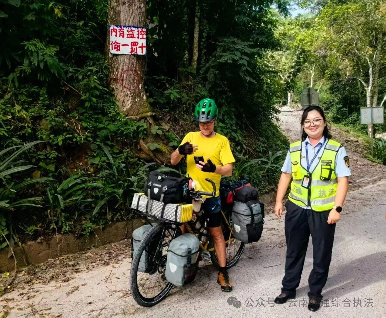 10月20日午后,勐腊大队执法人员巡查至国道G213策磨线急弯路段时,发现一名外国骑行者驻足路边,抬手挥舞、面露焦灼。执法人员通过简单英语口语搭配翻译软件沟通,得知该游客为法国人,计划骑行前往勐腊县城,因山区路况陌生迷失方向,对沿途部分路段施工情况也毫不知情,若贸然前行可能陷入通行困境。
