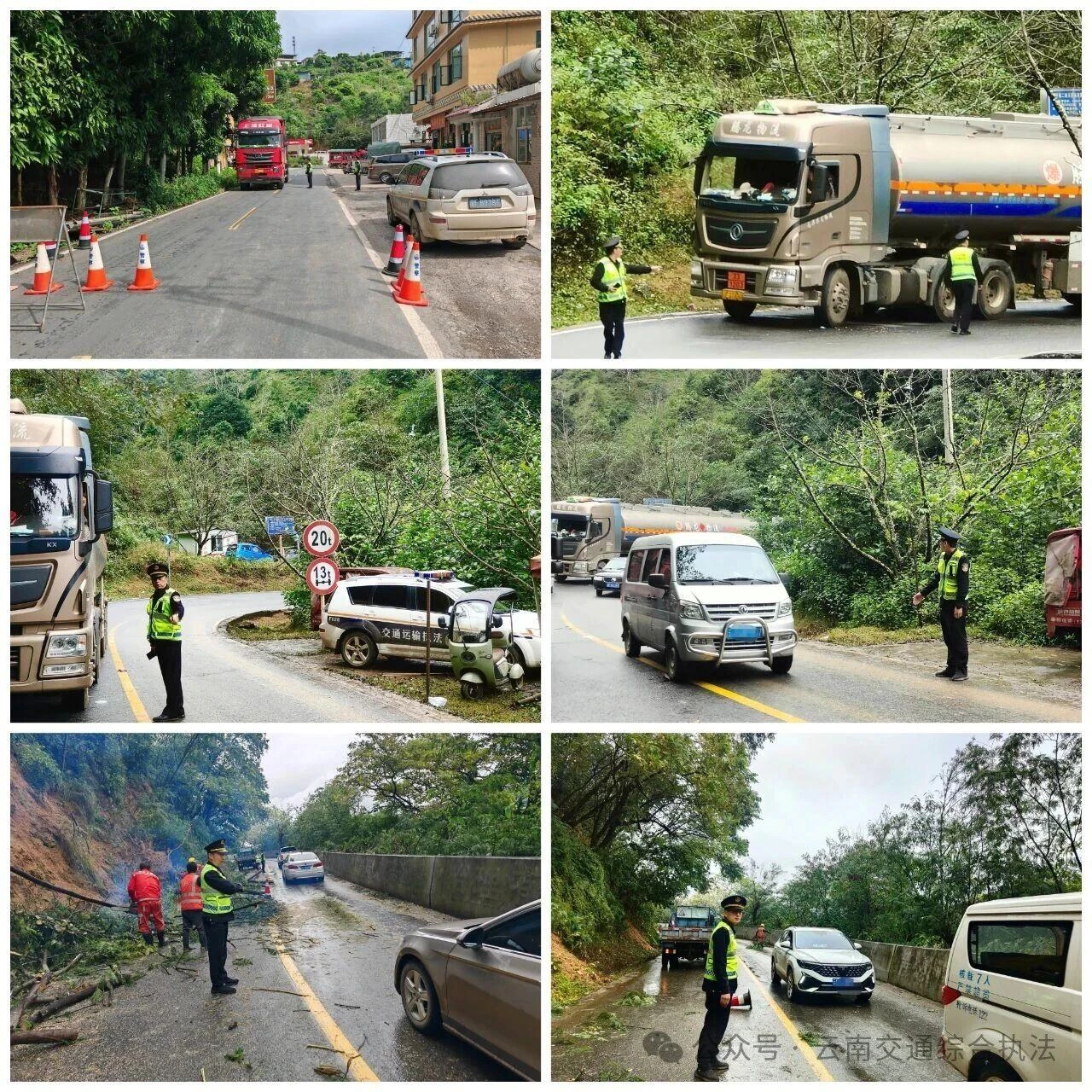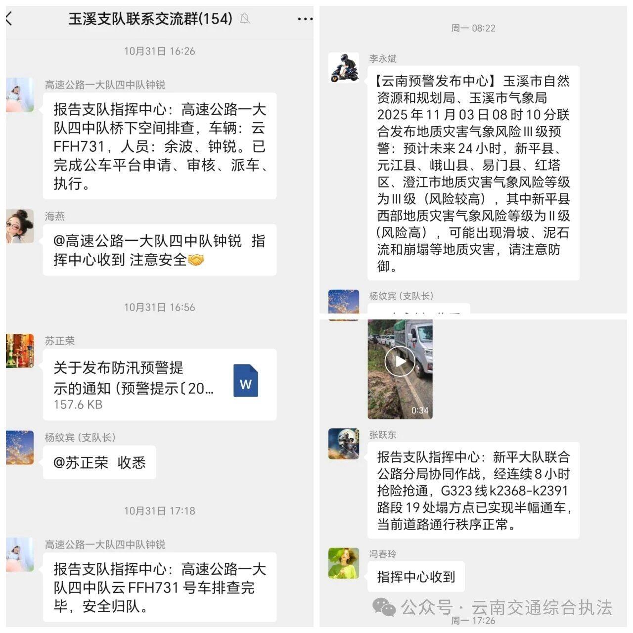 11月1日夜间起,玉溪市新平县遭遇持续强降雨,G323线新平段、镇沅段相继发生多处山体滑坡、泥石流和塌方灾害,道路通行严重受阻。险情发生后,省交通执法局玉溪支队坚决贯彻“人民至上、生命至上”理念,迅速启动应急响应,立即调度新平大队投入抢险一线。新平大队严格执行“1262”精细化预报与应急响应机制,第一时间赶赴现场处置的同时,规范做好阻断信息上报工作,为上级指挥决策提供及时、准确的信息支撑。