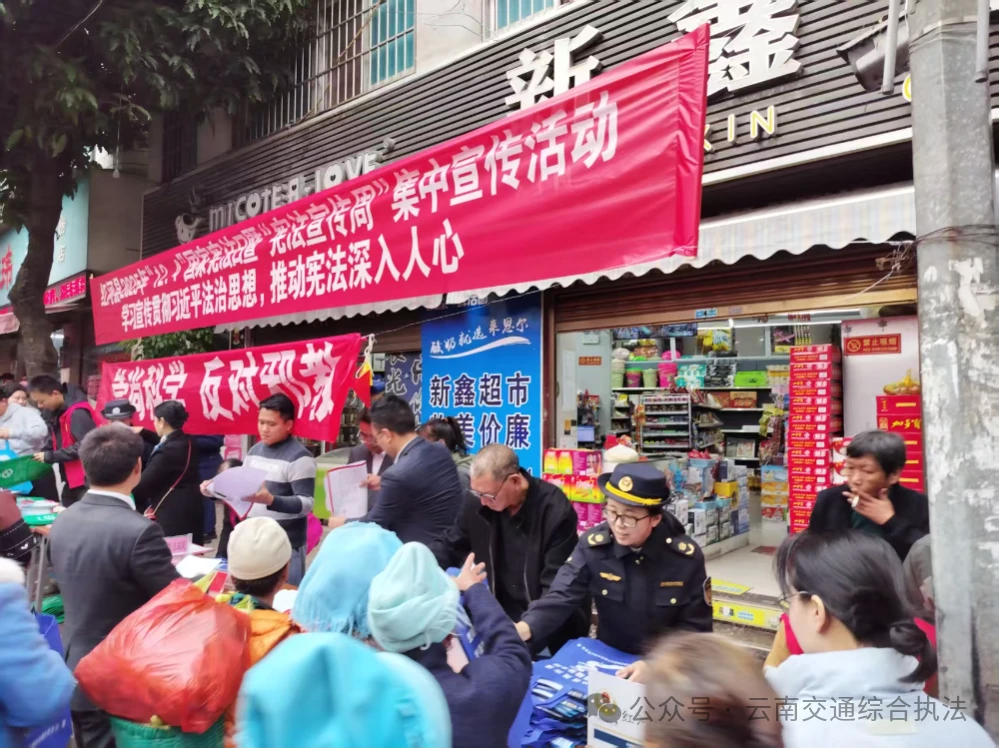 开远大队主动对接开远市司法行政部门,选派业务骨干参与开远市人民政府组织的宪法集中宣传活动,现场为群众讲解交通运输领域法治要点,利用超限运输检测站、执法车辆车载显示屏,滚动播放宪法宣传标语,实现宣传“线上+线下”全覆盖。