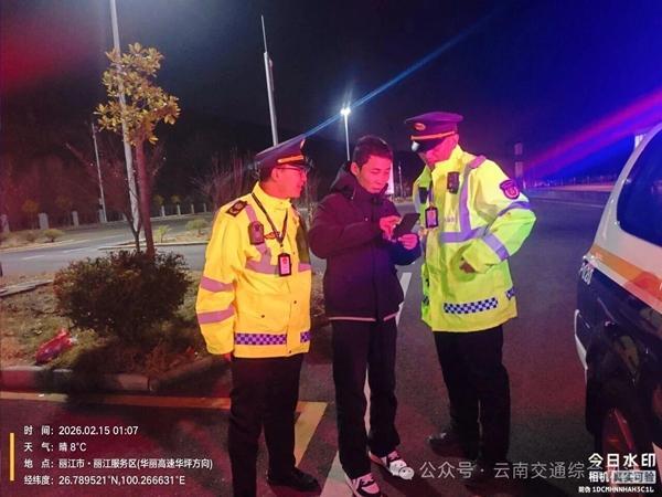执法人员于凌晨01时07分抵达现场。经了解得知该游客为享受高速公路免费通行政策,到达丽江服务区后将车辆暂时停放在丽江服务区(永胜至丽江方向),随后搭乘网约车车前往丽江城区游玩。待免费时段开启后,又打车返回取车,却因搞错服务区方位,被误送至丽江服务区(丽江至永胜方向),人生地不熟的他一时陷入困境,遂拨打求助电话。