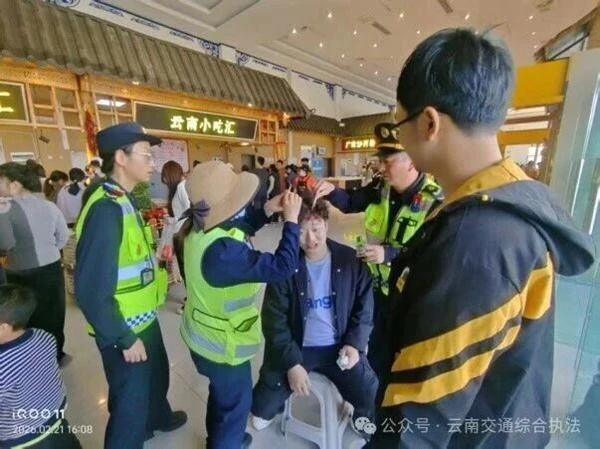 2月21日下午,大理支队执法人员在云南驿服务区(上行线)巡查时,发现几名男子神色紧张,其中一人捂着头部,指缝渗血。带班中队长立即上前询问,得知这是一行返程游客,在服务区休息时不慎撞破头部,流血不止。执法人员迅速引导伤者至服务区便利店前台,不到一分钟取来急救药箱,与服务区工作人员分工协作,有条不紊地为伤者清创消毒、包扎伤口。包扎完毕后,执法人员递上加糖温水安抚伤者,询问得知其头晕后,嘱咐同伴送其前往医院检查,并主动告知最近卫生院位置和路线,全程贴心叮嘱,用细节传递执法温度。