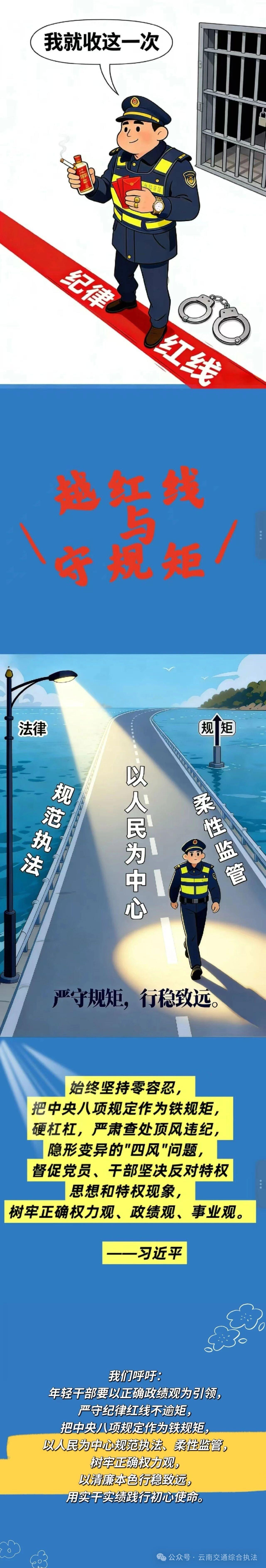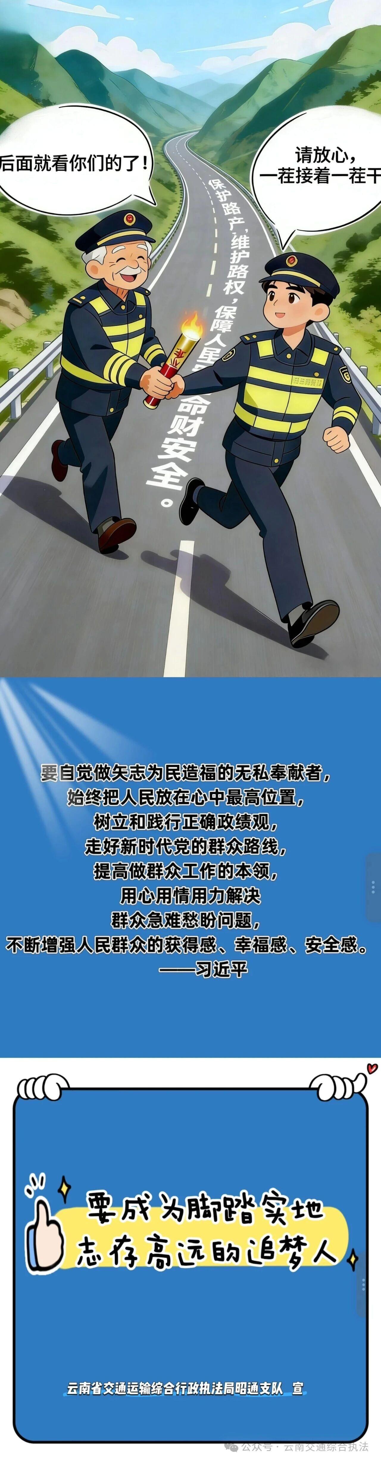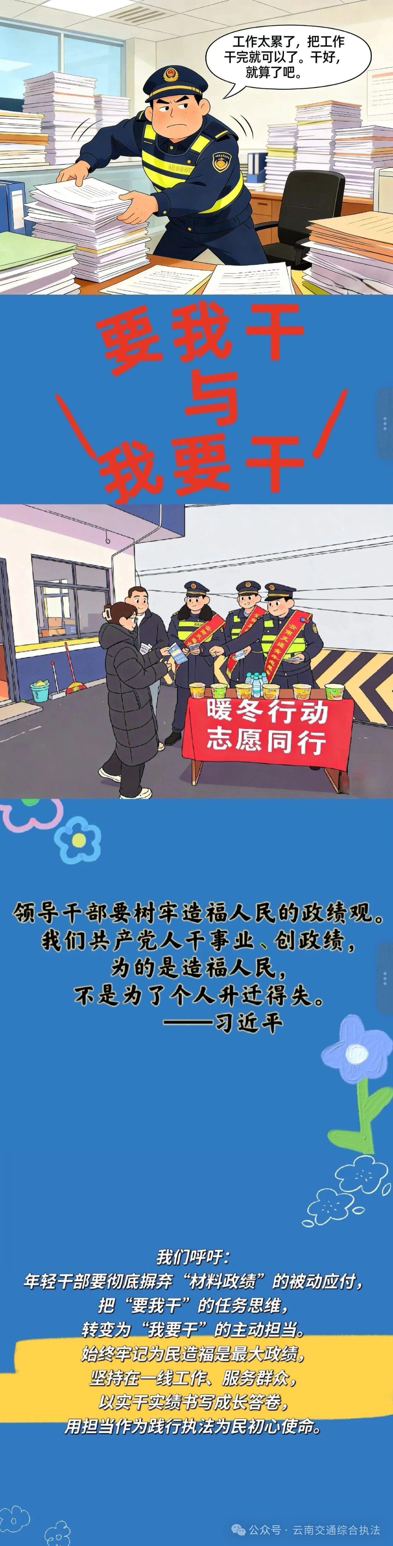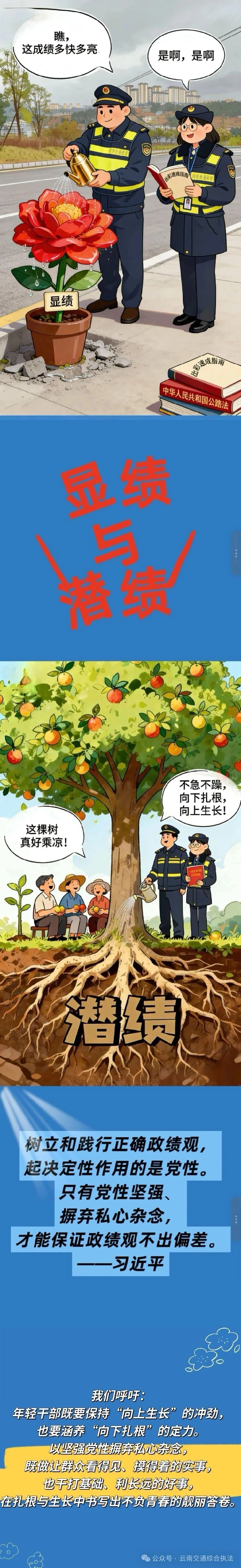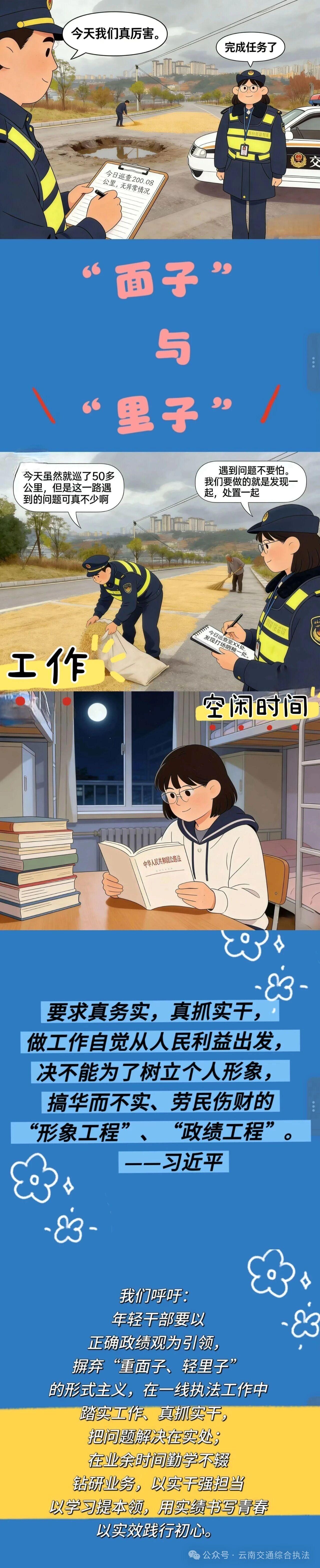 昭通支队团委以漫画为载体,紧扣树立和践行正确政绩观学习教育要求,围绕“踏实工作与加强学习”“明晰潜绩与显绩并重”“从‘要我干’到‘我要干’”“不越红线、严守纪律”“传承前辈经验再出发”五大主题,向全体年轻干部发出倡议:要树立和践行正确政绩观,争做脚踏实地、志存高远的新时代追梦人,以实干担当书写青春亮丽答卷。