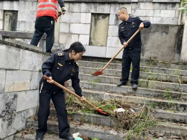 在盐津大队,主题党日多了一份“泥土味”。盐津大队党支部联合盐津公路分局,组织党员干部和青年执法人员手持铁锹、扫帚,全面清理烈士陵园内的杂草、落叶、淤泥。大家分工协作,以最质朴的劳动为先烈安息之地拂去尘埃,让主题党日在劳动实践中更具温度。