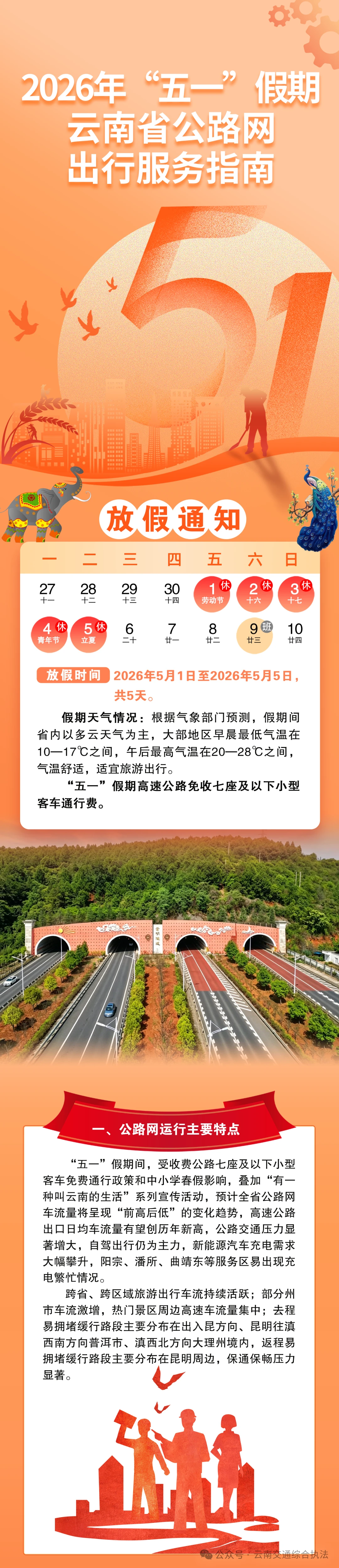 连续5天,免费!2026年“五一”假期云南省公路网出行服务指南